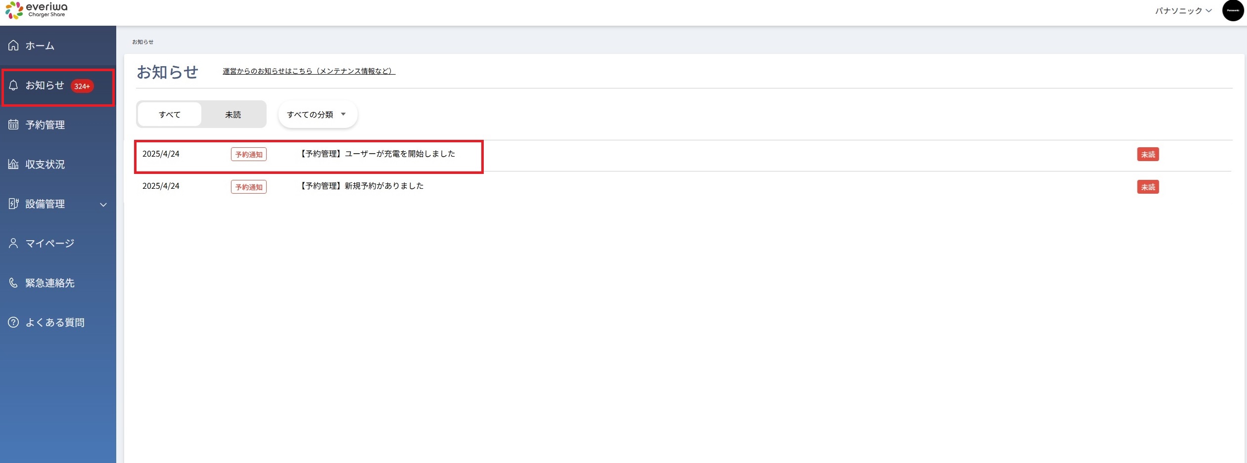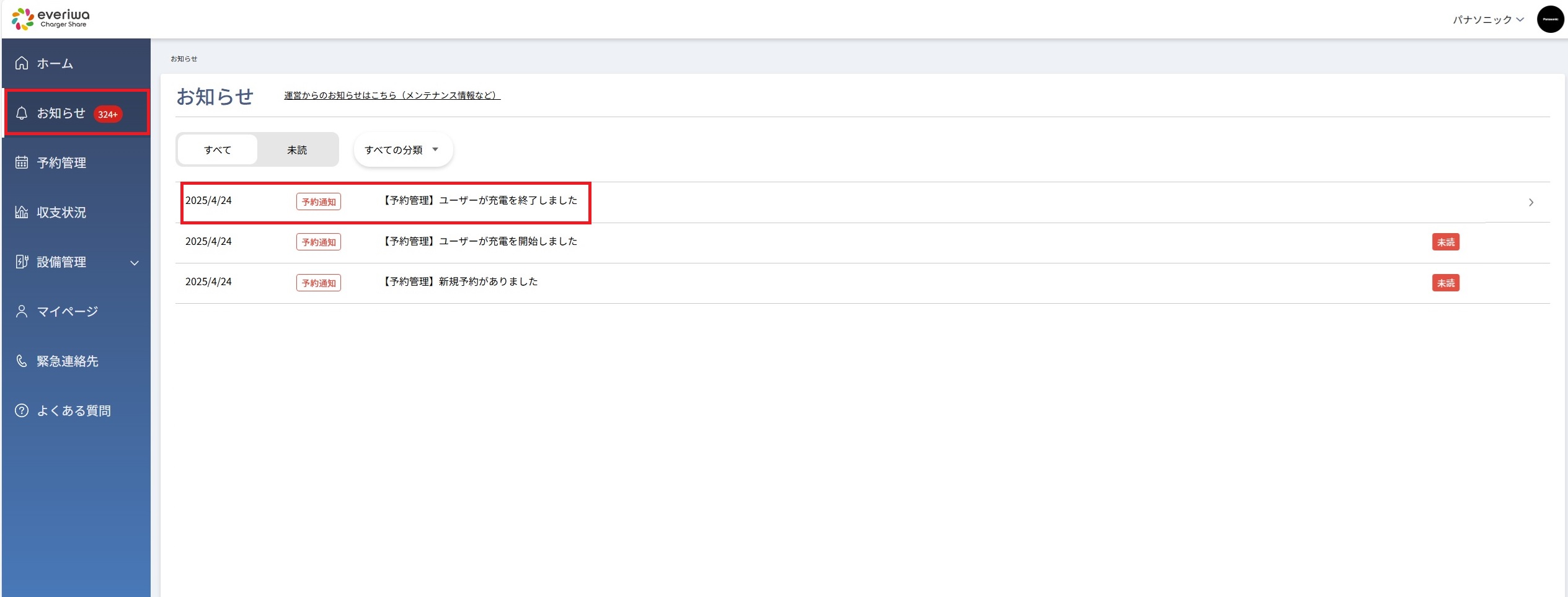 2.ユーザーが充電を開始すると通知が届きます。通知はホームのメニューバー>[お知らせ]に表示されます。